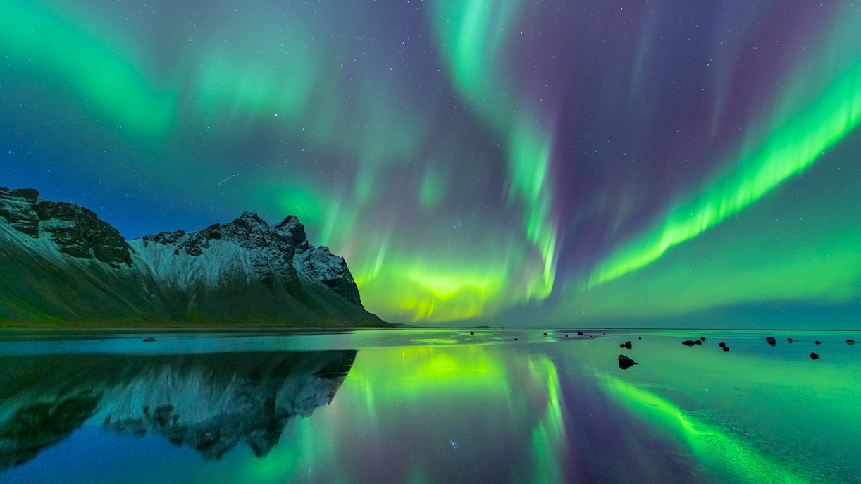 Iceland's dramatic landscapes—volcanic craters, glaciers, and black sand beaches—create the perfect backdrop for the auroras. While Reykjavík is a good base, you can venture to nearby dark spots like Thingvellir National Park or Kirkjufell Mountain for better visibility.