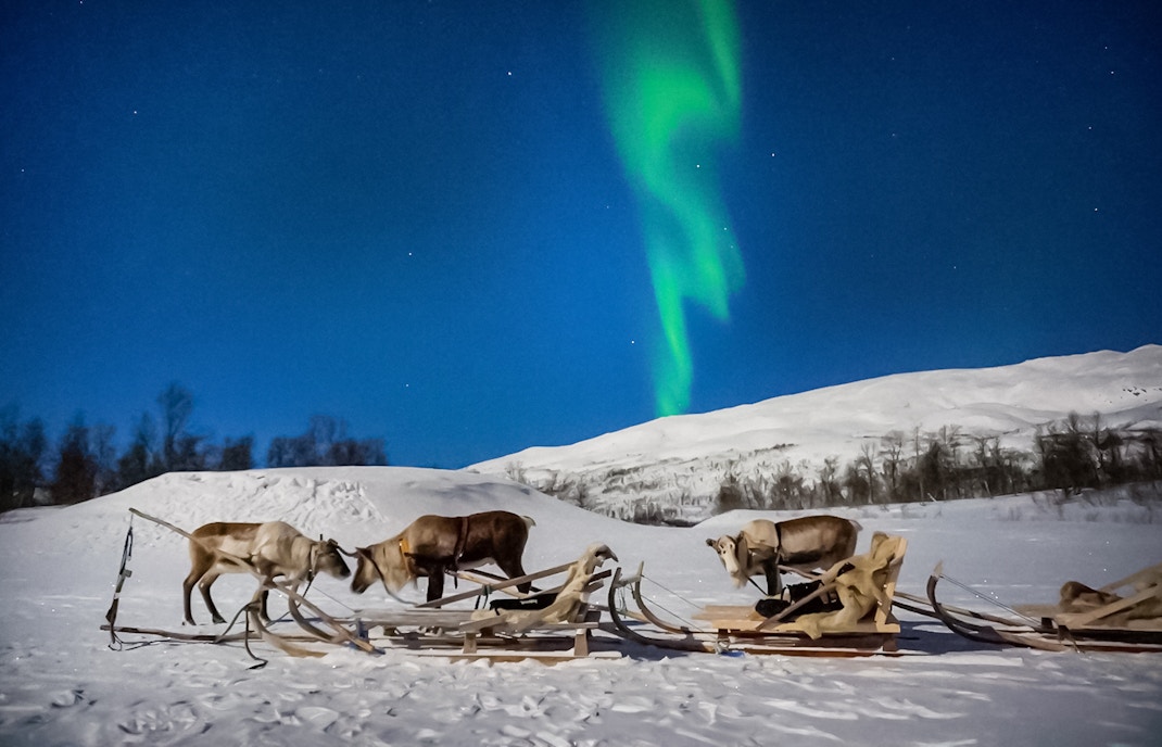 Discover Sámi culture and folklore on a reindeer sledding journey under the Northern Lights.